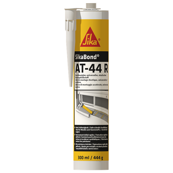 SikaBond® AT-44 R, 1K-zähelastischer Klebstoff auf SMP-Basis mit sehr schneller Hautbildung und hoher Klebkraft zur universellen Nutzung auf sehr vielen Untergründen im Innen- und Aussenbereich.